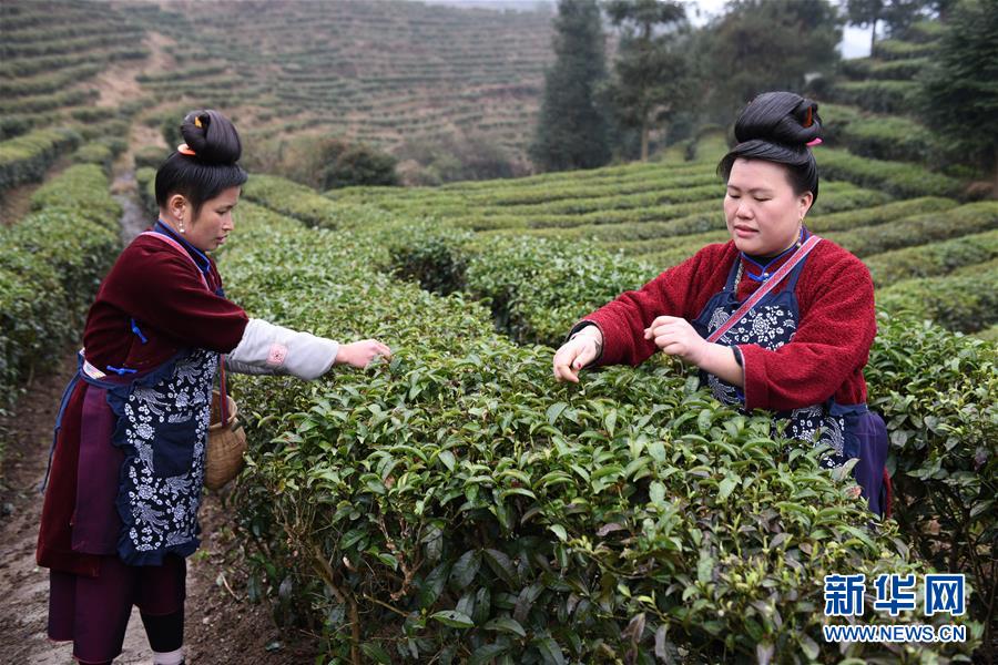 采茶工在丹寨縣龍泉鎮(zhèn)馬寨村的茶園里采摘春茶(3月16日攝)。新華社記者 楊文斌 攝
