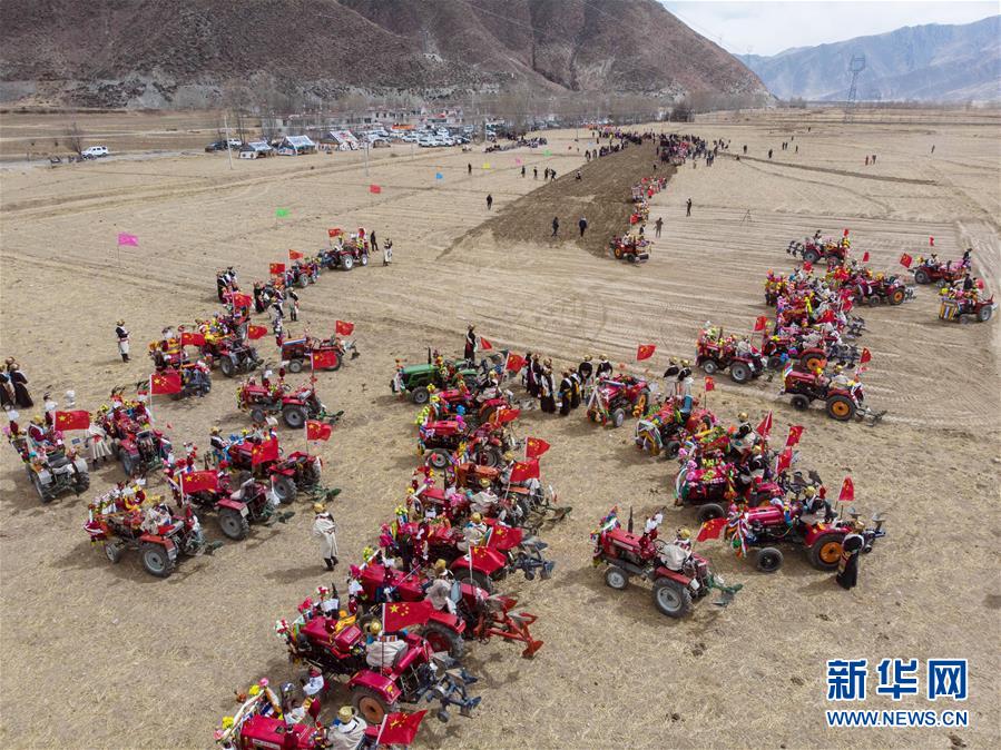 3月16日在拉薩市達孜區(qū)唐嘎鄉(xiāng)拍攝的開耕儀式現(xiàn)場(無人機拍攝)。 當日,西藏各地男女老幼身著節(jié)日盛裝,駕著一輛輛由彩旗、花朵裝扮一新的拖拉機,涌向待墾的農田,載歌載舞迎來一年一度的開耕儀式。 新華社發(fā)(孫非 攝)