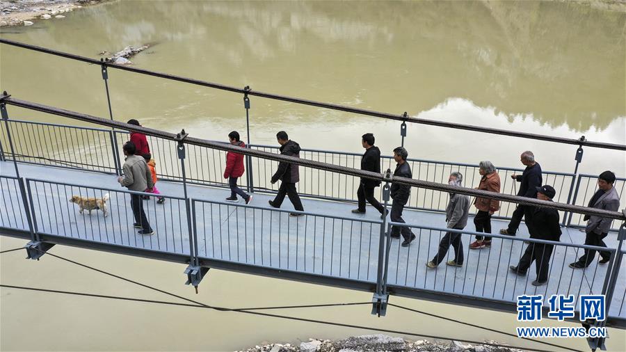 3月25日,略陽縣徐家坪鎮(zhèn)藥木院村村民走在新修的鋼結構吊橋上。 新華社記者陶明攝