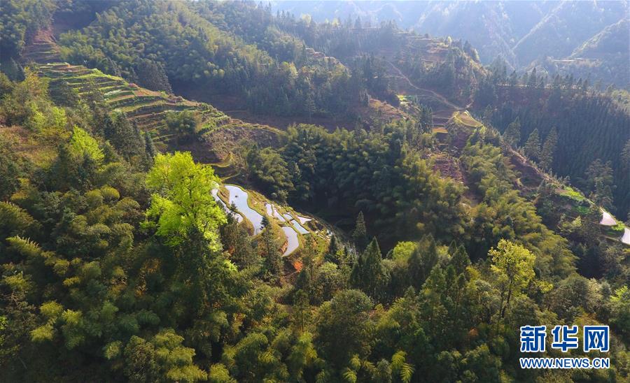 這是廣西融水苗族自治縣桿洞鄉(xiāng)黨鳩村的田園春色(3月29日無人機拍攝)。