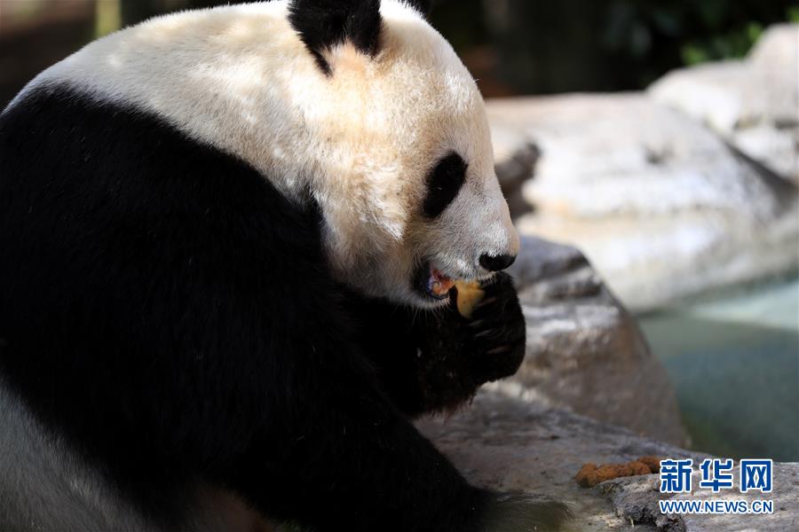 4月6日,在美國(guó)圣迭戈動(dòng)物園熊貓館,大熊貓“白云”在吃水果。新華社記者李穎攝