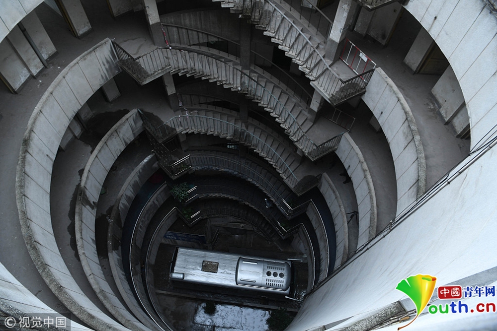 2018年12月6日,重慶江北紅旗河溝汽車站內(nèi),有一棟獨特的八層圓環(huán)狀建筑,底層每天有不少進出站的客車通行。圖為公交車穿過8層空心圓筒樓。