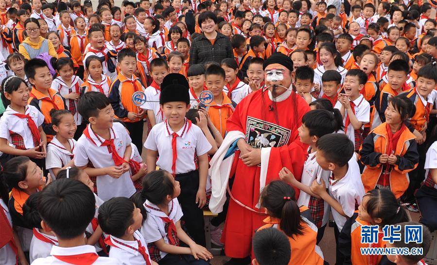 5月8日,滄州市小鳳霞評(píng)劇團(tuán)演員在肅寧縣第三實(shí)驗(yàn)小學(xué)與學(xué)生互動(dòng)。