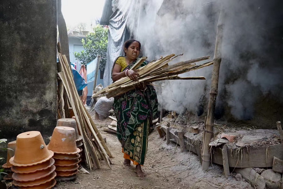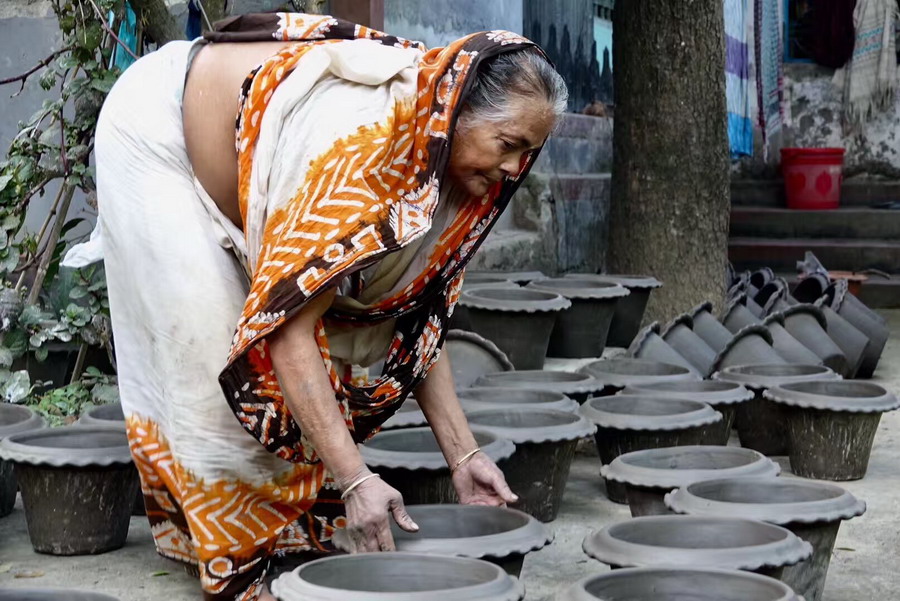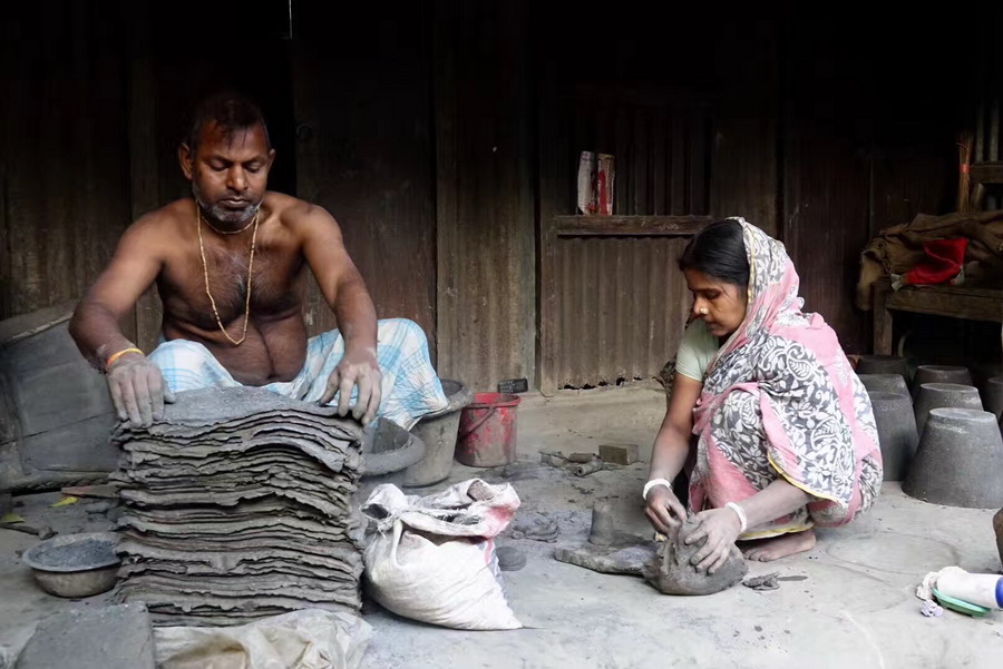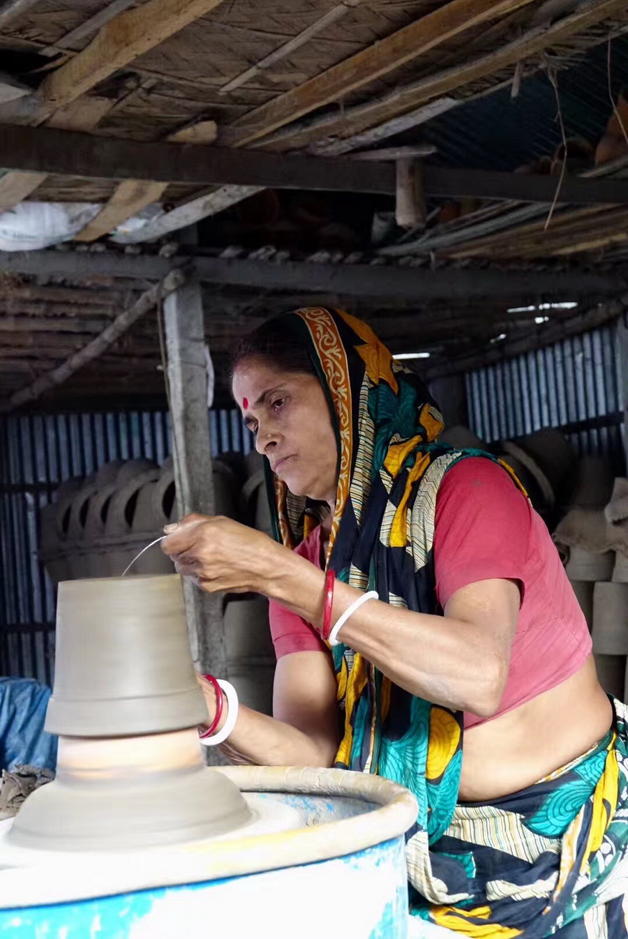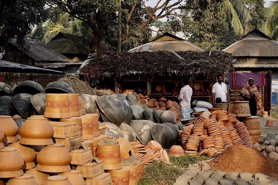 達(dá)卡遠(yuǎn)郊區(qū)一個印度教徒聚居的村莊,幾乎家家戶戶都開辦制陶作坊,以傳統(tǒng)工藝制作陶盆、陶罐、陶盤和建筑裝飾陶器,遠(yuǎn)銷孟加拉國內(nèi)各地。李仁奇 攝