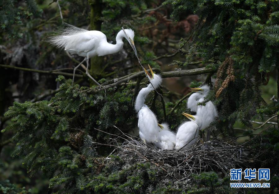 在江西省南昌市新建區(qū)象山森林公園內(nèi),白鷺和自己的雛鳥在一起(5月21日攝)。 近日,在江西省南昌市新建區(qū)象山森林公園內(nèi),已安家筑巢的大批鷺鳥陸續(xù)孵化出了后代。象山森林公園有著“鷺鳥王國”的美譽,生態(tài)環(huán)境良好,每年都會吸引白鷺、蒼鷺、夜鷺等種類的鷺鳥飛抵棲息和繁衍后代。 新華社記者 彭昭之 攝
