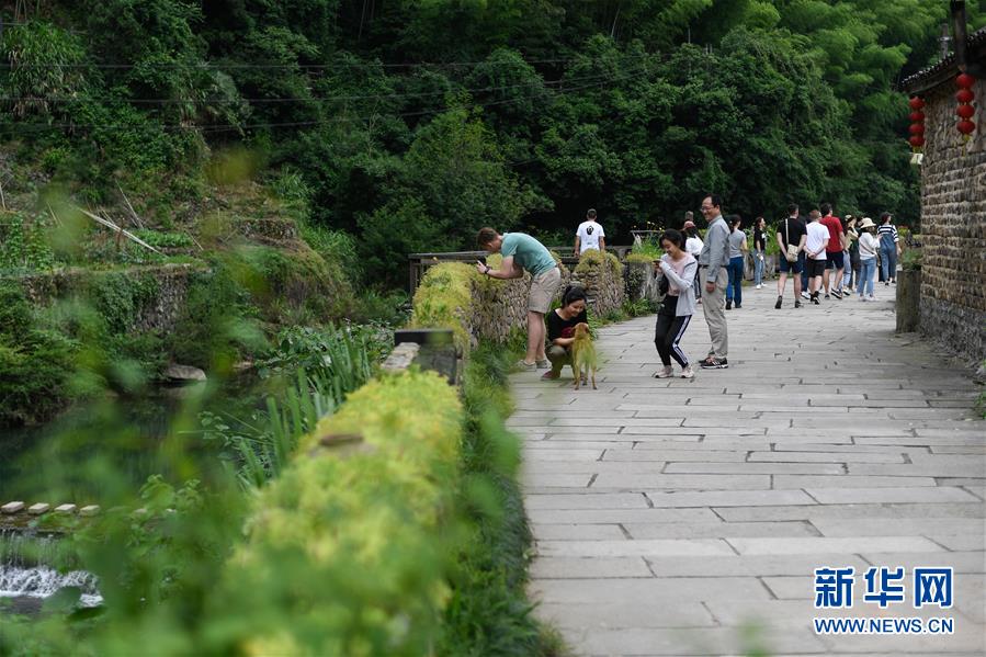 中外游客在石舍村游覽(5月25日攝)。 石舍村是浙江省桐廬縣富春江鄉(xiāng)村慢生活體驗區(qū)中的三個村落之一,位置偏僻,依溪而居,風景秀美。近年來,石舍村結(jié)合古建筑保護工作,在清潔、美化村莊的基礎(chǔ)上,對一些廢棄古建筑進行修繕,引入咖啡館、民宿等文化創(chuàng)意類項目,優(yōu)良的生態(tài)環(huán)境和濃郁的文化氛圍吸引大批游客前來體驗,小山村走上了一條發(fā)展美麗經(jīng)濟之路。2018年,石舍村接待游客10萬8千余人次,旅游經(jīng)營凈收入1260余萬元。 新華社記者 黃宗治 攝