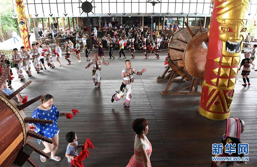 游客與基諾族大鼓舞演員一起跳舞(6月1日攝)。 在云南省西雙版納傣族自治州景洪市基諾山基諾族鄉(xiāng)的基諾族村寨,每天的基諾大鼓舞表演吸引了眾多游客前來觀賞體驗,帶動了基諾族群眾就業(yè)和增收。基諾族大鼓舞蘊(yùn)涵豐富的歷史文化內(nèi)涵,已被列入國家級非物質(zhì)文化遺產(chǎn)保護(hù)名錄。 新華社記者 楊宗友 攝