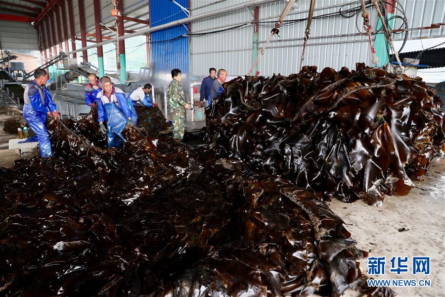 4月10日,霞浦縣長春鎮(zhèn)埕塢村一家海帶加工廠內(nèi),工人在搬運剛收獲的海帶。近日,福建省寧德市霞浦縣30余萬畝養(yǎng)殖海帶進入收獲季節(jié),當(dāng)?shù)仞B(yǎng)殖戶搶抓晴好天氣,收獲海帶。海帶養(yǎng)殖是霞浦縣群眾增收致富的支柱產(chǎn)業(yè)。2018年該縣海帶產(chǎn)量14萬余噸。新華社記者 姜克紅 攝