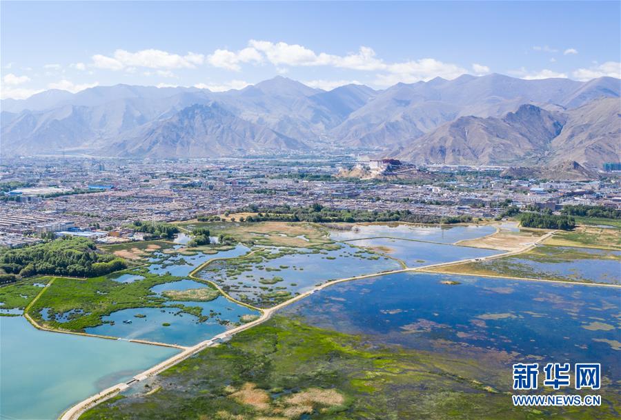 被譽(yù)為“拉薩之肺”的拉魯濕地(6月5日無(wú)人機(jī)拍攝)。