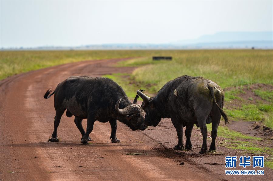 6月17日,在肯尼亞馬賽馬拉國家保護區(qū),兩頭水牛在打斗。 新華社記者 李琰 攝