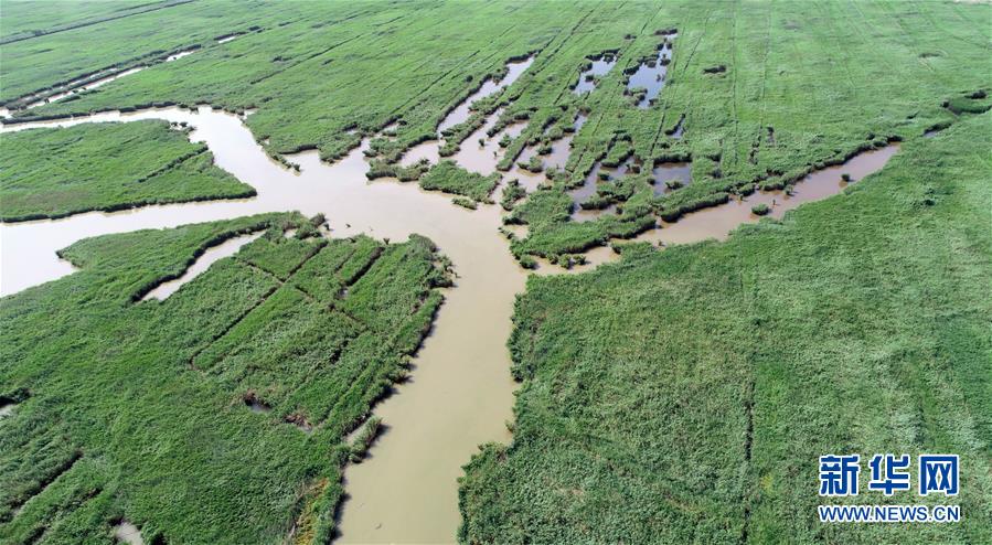 這是天津市寧河區(qū)七里海濕地內(nèi)蘆葦和水面形成的圖案(6月22日無(wú)人機(jī)拍攝)。新華社記者 岳月偉 攝