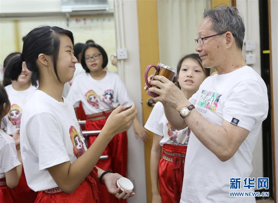 孩子們給79歲的粵劇名伶楊劍華敬茶(6月8日攝)。 聲輝粵劇推廣協(xié)會成立于2003年,是香港重要粵劇藝術(shù)團(tuán)體之一,致力于向青少年推廣粵劇。協(xié)會目前有兩個(gè)初班,3個(gè)中班,一個(gè)青少年班?;泟∮址Q“廣東大戲”,表演技藝包括“唱做念打”,即唱功、身段、臺詞、武打,主要流行于廣東、廣西和香港、澳門等地區(qū)。2009年,粵劇被列入聯(lián)合國教科文組織人類非物質(zhì)文化遺產(chǎn)代表作名錄,今年正逢十周年。 新華社記者 吳曉初 攝
