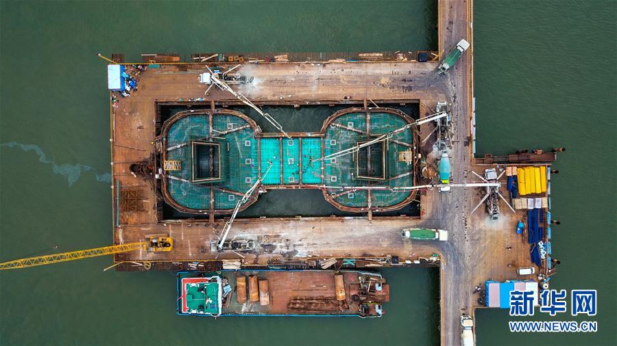 這是7月6日無(wú)人機(jī)拍攝的湛江調(diào)順跨海大橋東岸主塔墩承臺(tái)建設(shè)現(xiàn)場(chǎng)。 新華社記者 劉大偉 攝