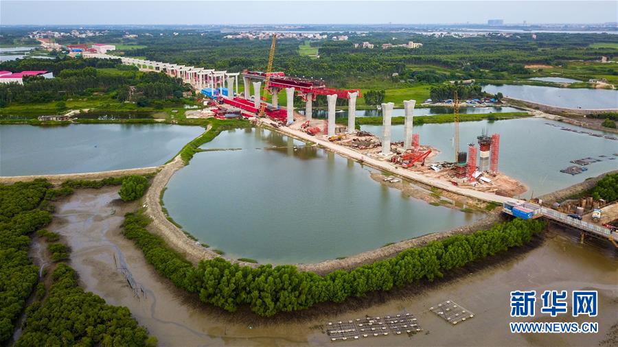 這是7月6日無人機拍攝的湛江調(diào)順跨海大橋東岸移動模架施工現(xiàn)場。 新華社記者 劉大偉 攝