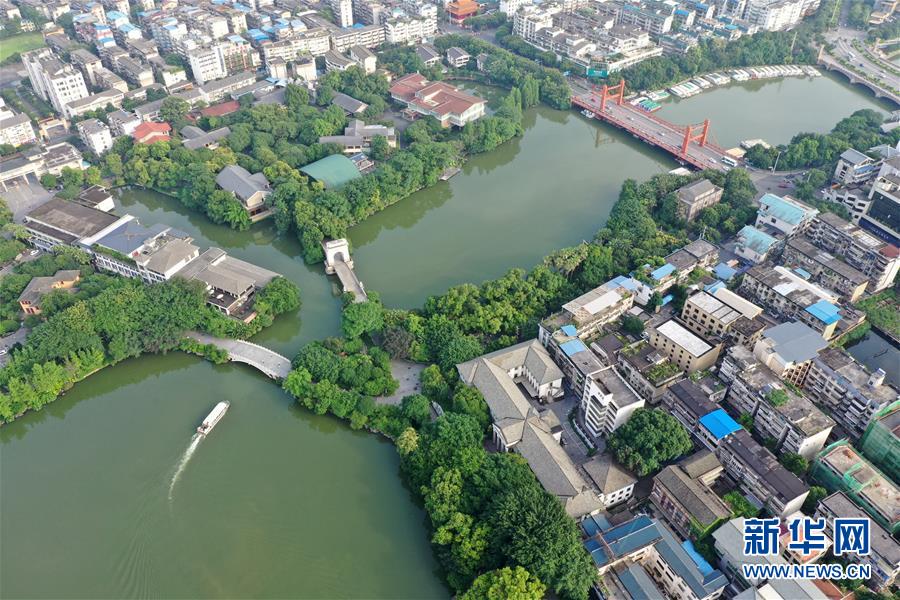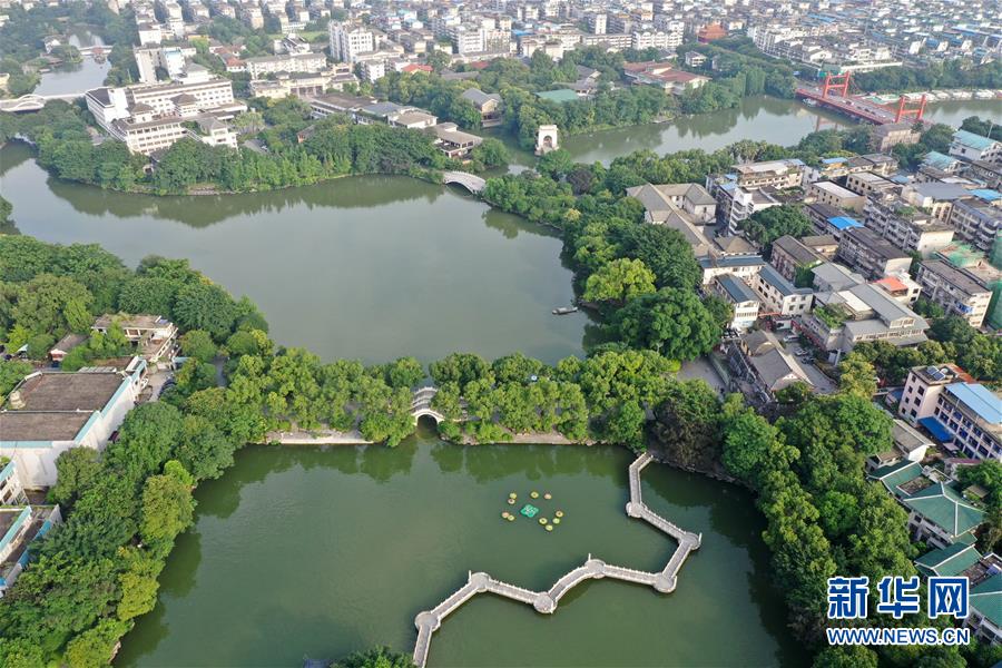 桂林市榕湖景觀(7月1日無人機(jī)拍攝)。 夏日時(shí)節(jié),廣西桂林市區(qū)內(nèi)的榕湖、杉湖、桂湖、木龍湖等地綠樹成蔭、景色迷人。 新華社記者陸波岸攝