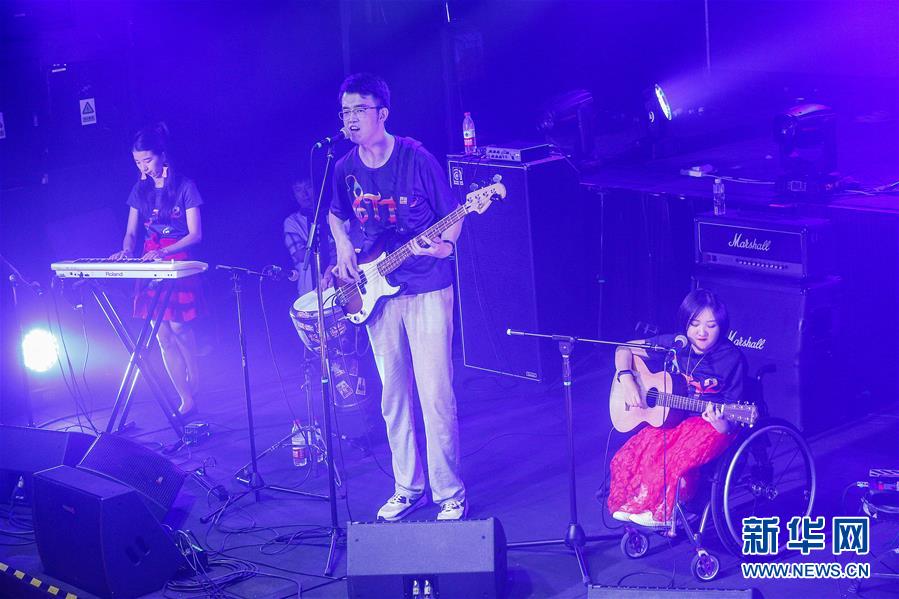 8月14日,8772樂隊(duì)成員蘇佳宇(中)在演唱會(huì)上表演。 新華社記者張玉薇攝