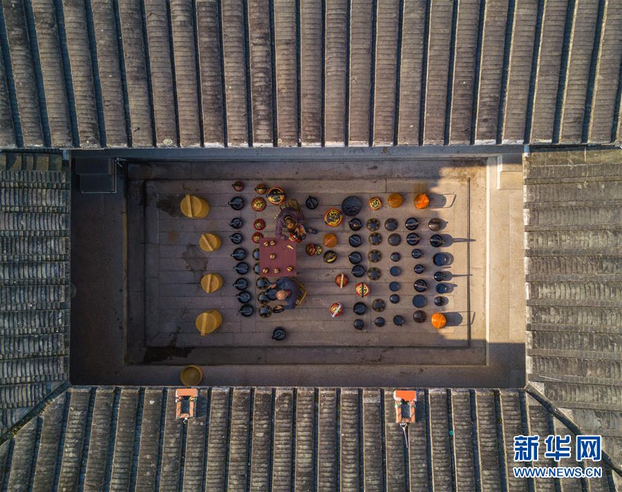 在福建省永春縣仙夾鎮(zhèn)龍水村,村民在老宅制作當(dāng)?shù)靥厣峄@(1月28日無人機(jī)拍攝)。 新華社記者 宋為偉 攝