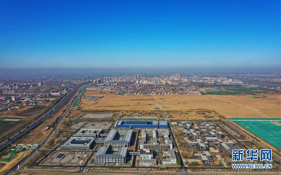 3月31日無人機拍攝的雄安新區(qū)市民服務(wù)中心(前)遠處為容城縣城區(qū)。新華社記者牟宇攝
