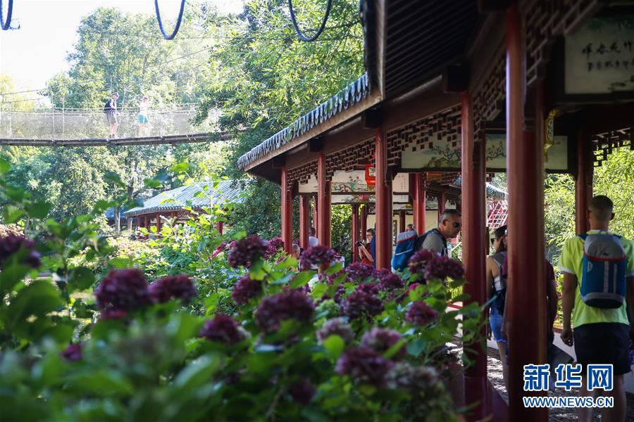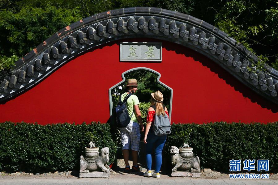 8月24日,在比利時(shí)布呂熱萊特市,游客參觀天堂動(dòng)物園的“中國園”中的一處長廊。新華社記者 鄭煥松 攝