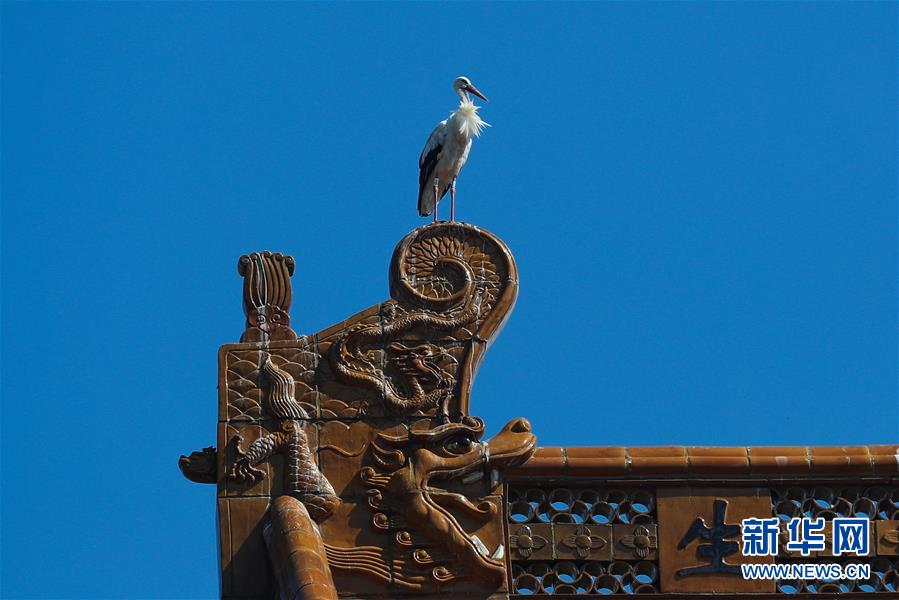 8月24日,在比利時(shí)布呂熱萊特市,一只白鸛站在天堂動(dòng)物園“中國園”的建筑上。新華社記者 鄭煥松 攝