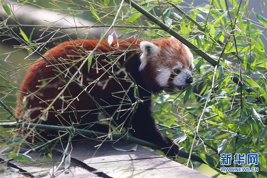 8月24日,在比利時(shí)布呂熱萊特市,一只小熊貓?jiān)谔焯脛?dòng)物園的“中國園”覓食。新華社記者 鄭煥松 攝