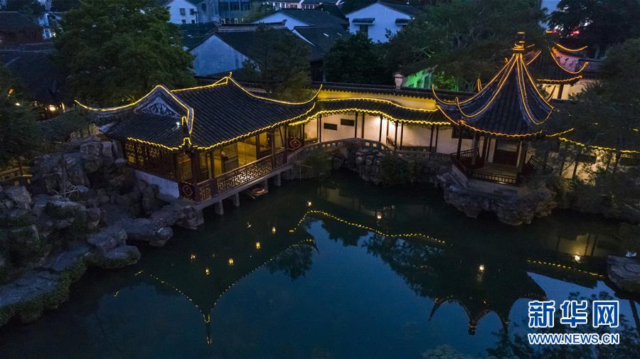 這是5月22日晚拍攝的蘇州網(wǎng)師園(無(wú)人機(jī)拍攝)。網(wǎng)師園是唯一在夜間面向公眾開(kāi)放的蘇州園林。 新華社記者 沈伯韓 攝