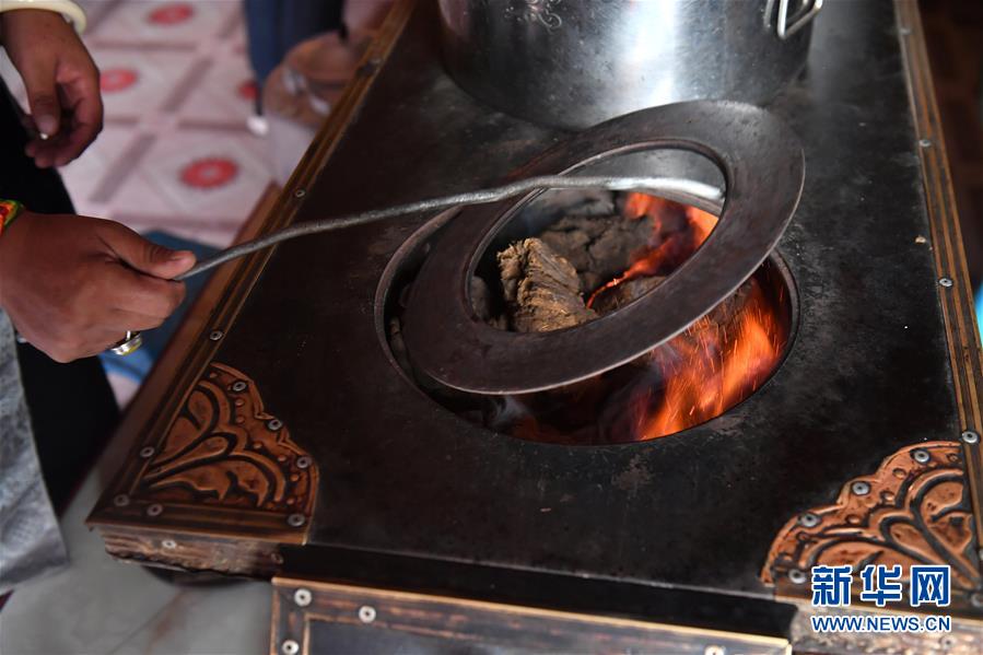 在青海省玉樹藏族自治州治多縣治渠鄉(xiāng)同卡村,村民布沙措江卓瑪給家中的爐子添加燃料——牛糞(9月12日攝)。在當(dāng)?shù)兀鍧嵀h(huán)保的牛糞依然是不少牧民選用的主要燃料。新華社記者 孫瑞博 攝
