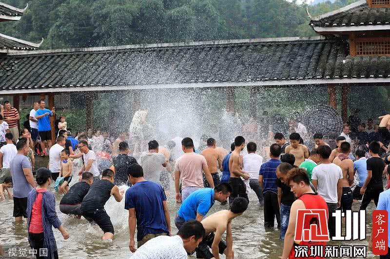 苗族群眾在活動場地內爭搶活魚,搶的魚越多,寓意福氣就越多。
