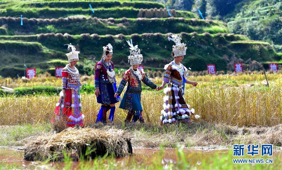 10月28日,在廣西融水苗族自治縣拱洞鄉(xiāng)龍令村,苗家姑娘前往田間觀看摸螺抓魚比賽。新華社記者 黃孝邦 攝
