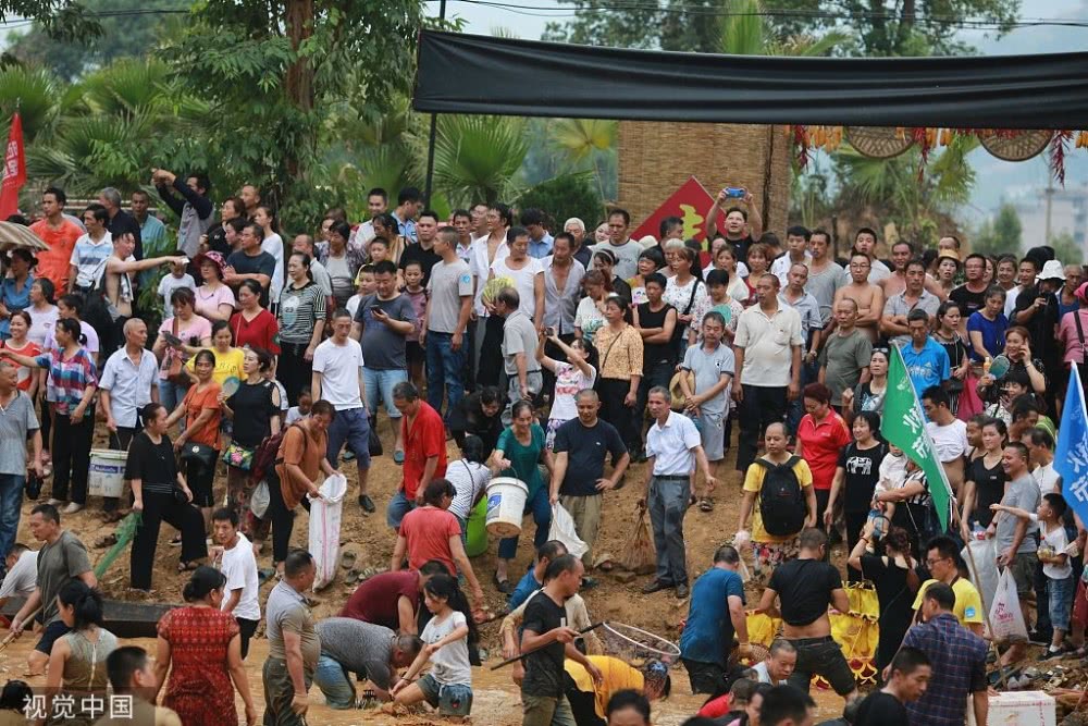 2019年9月7日,重慶,涪陵區(qū)曬秋捉魚活動(dòng)在紅酒小鎮(zhèn)舉行,現(xiàn)場上演搶魚“大戰(zhàn)”。
