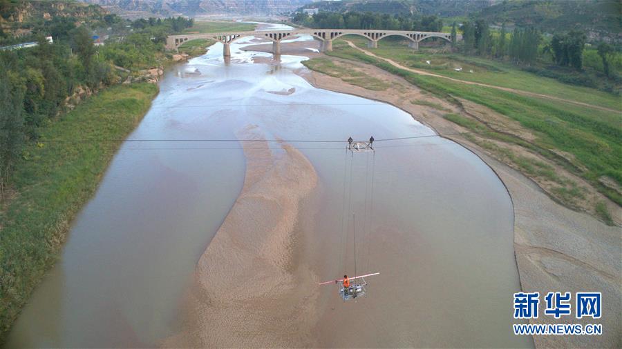 溫家川水文站站長(zhǎng)鄭威在窟野河取沙(9月7日攝)。新華社記者劉詩(shī)平攝