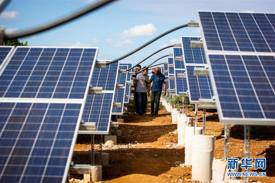 2013年11月3日,中古雙方施工人員在古巴首都哈瓦那市郊的展覽中心園區(qū)的中國援建的光伏電站內(nèi)工作。2013年11月4日,由中國北京控股集團有限公司捐建的古巴1兆瓦光伏電站正式并網(wǎng)發(fā)電。該項目為中古合作共建,中方提供設(shè)備及技術(shù)指導(dǎo)。新華社記者劉彬攝