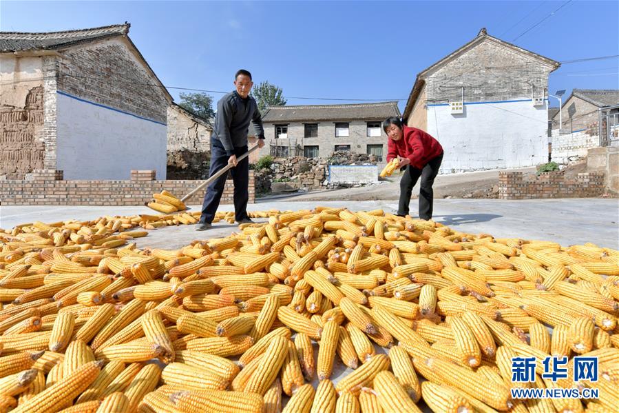 在奪火鄉(xiāng)高谷堆村,村民在晾曬玉米(10月13日攝)。 新華社記者 曹陽 攝