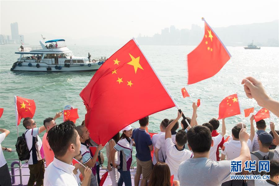 10月1日,香港市民在維多利亞港參加巡游。當(dāng)日,約300名香港市民以游船方式慶祝新中國(guó)成立70周年。 新華社記者翁忻旸攝