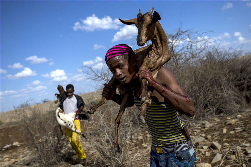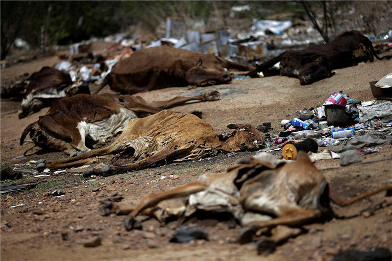 當(dāng)?shù)貢r(shí)間2016年12月15日,索馬里邦特蘭,干旱的土地上散布著羊的尸體。當(dāng)?shù)卦庥龈珊堤鞖?,牲畜受到危害?/p>