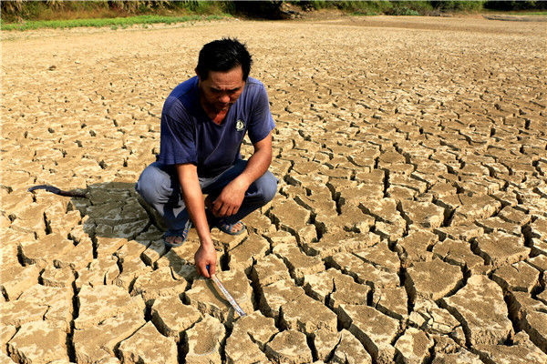 當(dāng)?shù)貢r(shí)間2016年5月13日,柬埔寨甘丹省,受厄爾尼諾現(xiàn)象影響,當(dāng)?shù)卦庥龈珊堤鞖?,池塘干涸開裂。