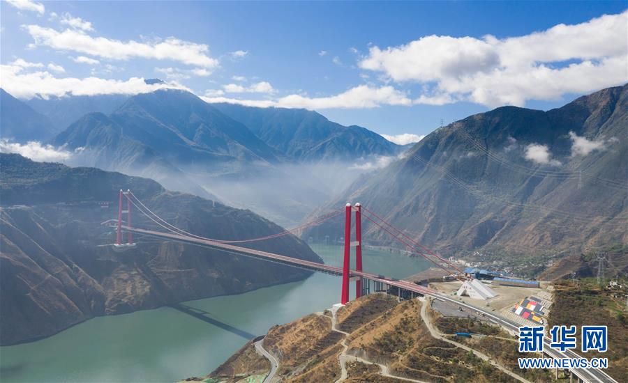 俯瞰雅康高速瀘定大渡河大橋(10月16日無人機拍攝)。該橋主橋為1100米單跨鋼桁梁懸索橋,2018年底建成通車。 新華社記者 江宏景 攝
