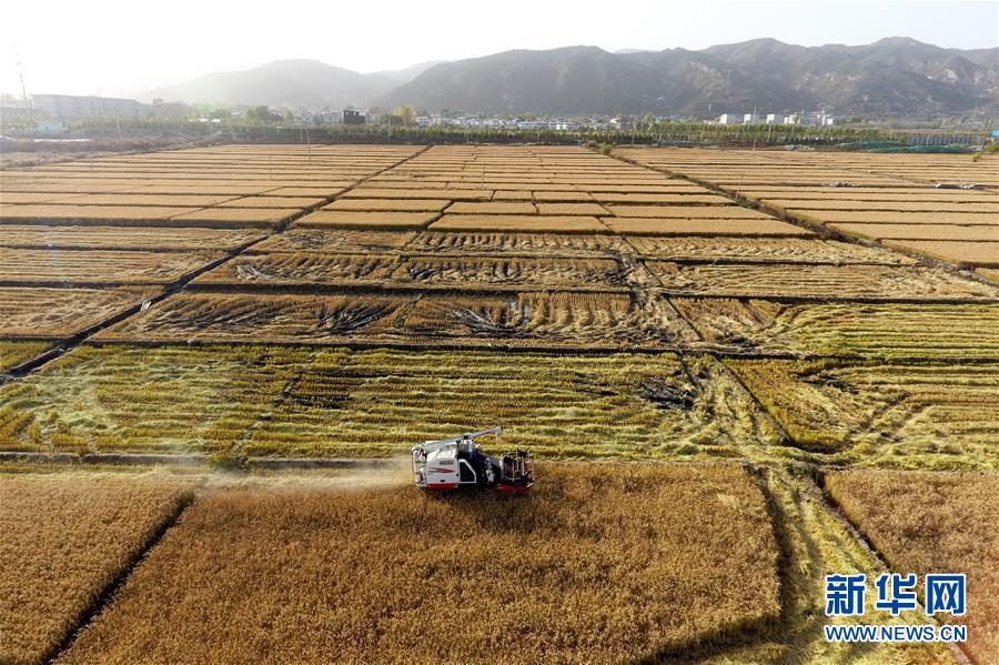 收割機在太原市晉源區(qū)赤橋村稻田里作業(yè)(10月28日無人機拍攝)。新華社記者詹彥攝