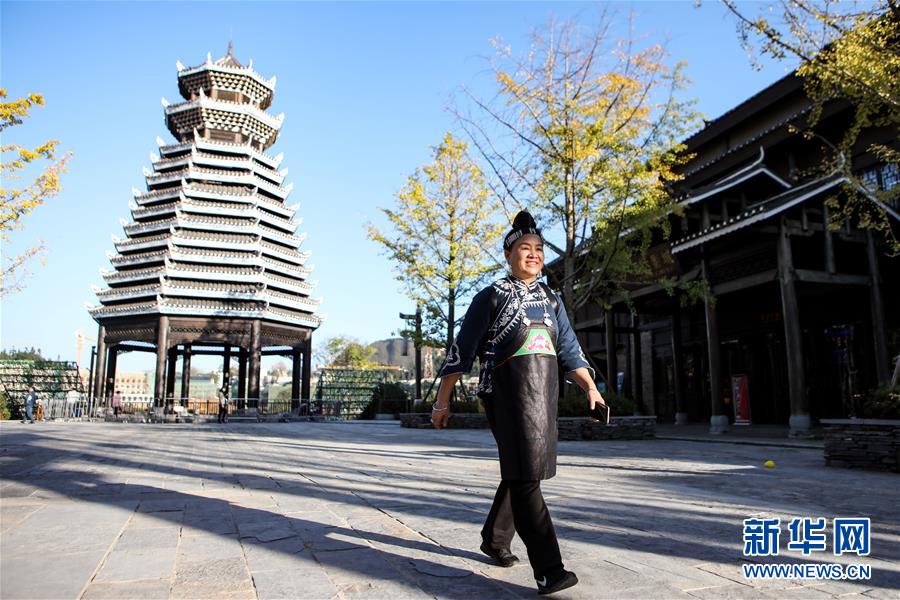 10月29日,楊芳從丹寨萬達小鎮(zhèn)內(nèi)的鼓樓前經(jīng)過。