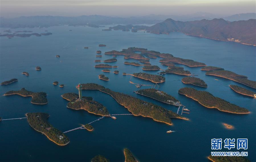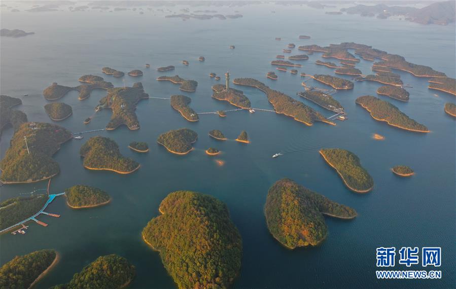 11月9日無(wú)人機(jī)拍攝的廬山西海。 當(dāng)日,落日余暉下的江西廬山西海山青水藍(lán),美不勝收。 新華社記者 周密 攝