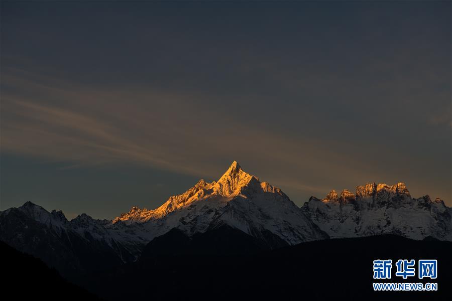 日出時分,陽光照射在梅里雪山緬茨姆峰上(11月8日攝)。 初冬時節(jié),位于云南省西北部的迪慶藏族自治州境內(nèi)的梅里雪山、普達措、納帕海、白水臺等景色迷人。 新華社記者 胡超 攝