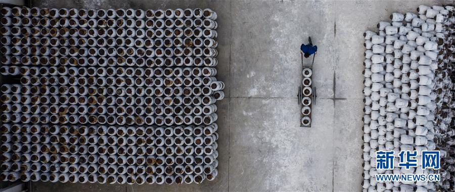11月7日,古越龍山紹興酒股份有限公司釀酒一廠的工人進行“開耙”攪拌(無人機拍攝)。新華社記者徐昱攝