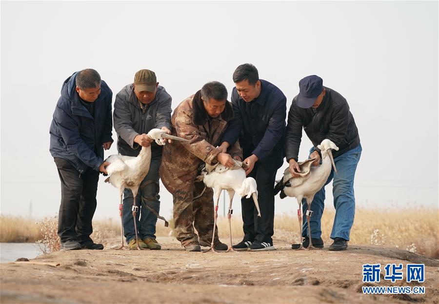 11月16日,在樂亭縣野生動物保護協(xié)會大清河鳥類救助站,工作人員放飛國家一級保護動物東方白鸛。新華社記者楊世堯攝