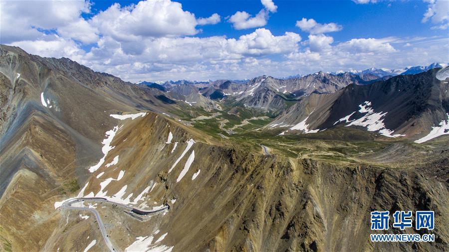 獨庫公路穿越海拔3390米的哈希勒根達坂(2017年7月13日無人機拍攝)。新華社記者江文耀攝