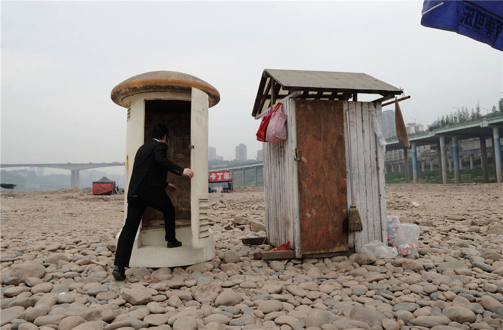 2013年04月02日,重慶,干枯河床上修建了臨時公共廁所。大動/視覺中國