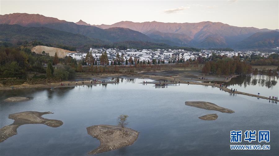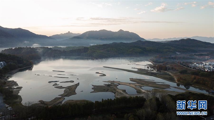 11月14日拍攝的安徽黟縣奇墅湖晨景(無人機航拍)。新華社記者張笑宇攝