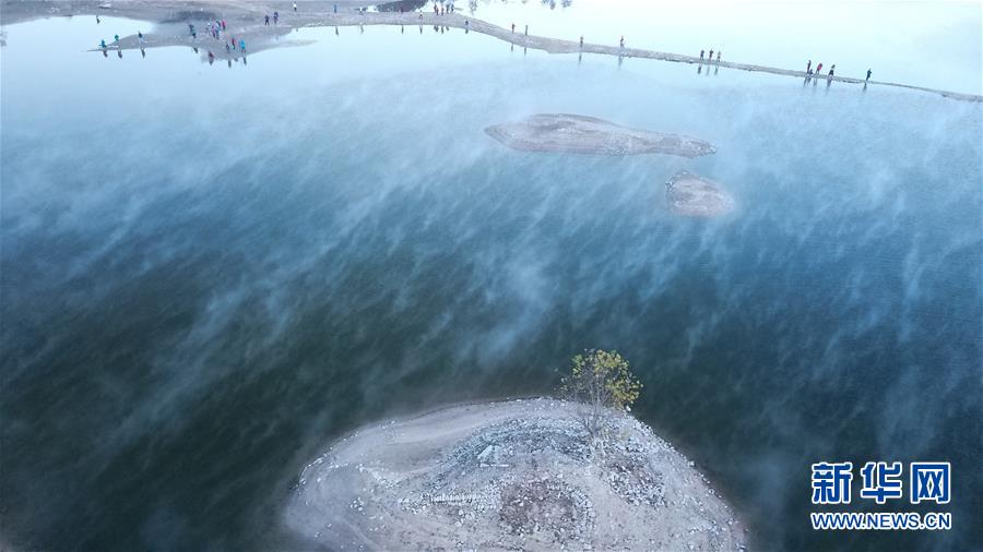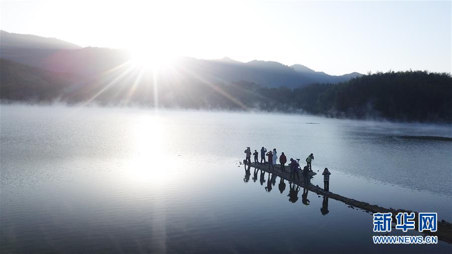 11月14日,游客在奇墅湖邊拍攝風光。 初冬時節(jié),安徽省黃山市黟縣奇墅湖晨霧縹緲,別具韻味。新華社記者劉軍喜攝