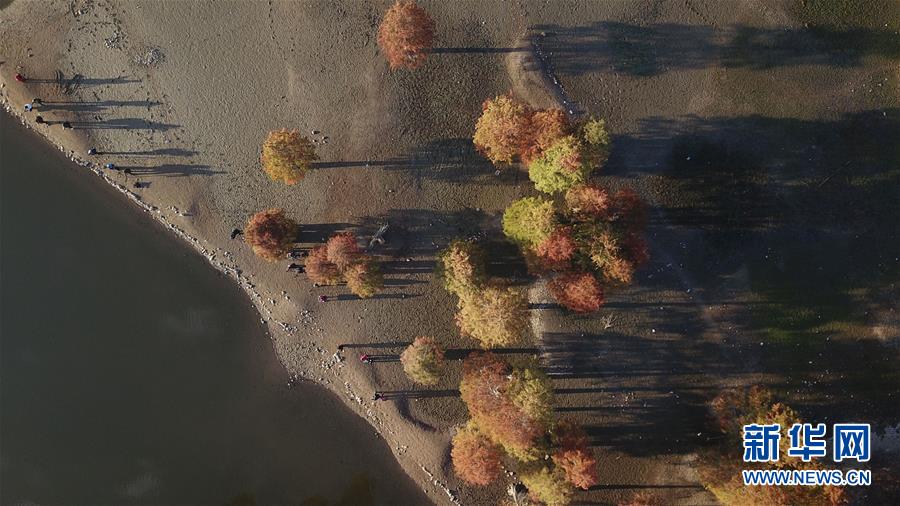 11月14日,游客在奇墅湖邊拍照(無人機拍攝)。新華社記者張端攝