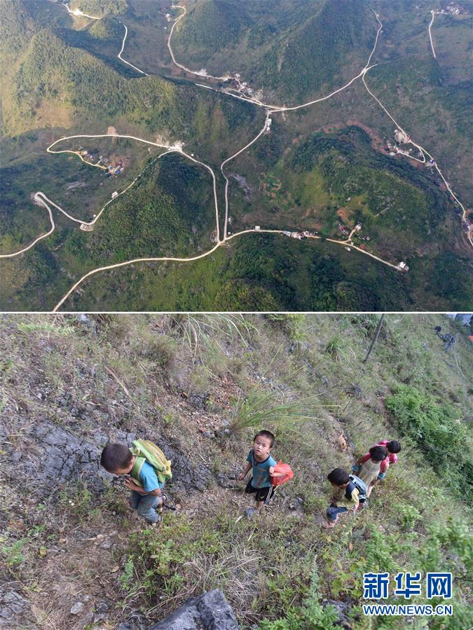 拼版照片:上圖為大化瑤族自治縣七百弄鄉(xiāng)弄雄村各自然屯之間的公路網(wǎng)(11月10日無(wú)人機(jī)拍攝);下圖為在弄雄村弄林屯,孩子們走在回家的山路上(2016年10月26日攝)。新華社記者黃孝邦攝