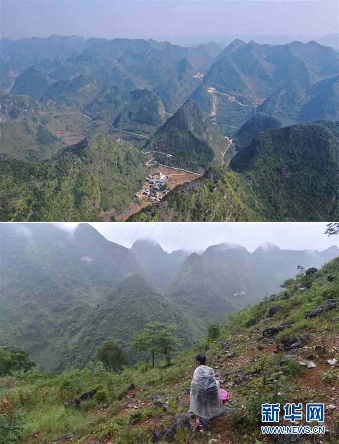 拼版照片:上圖為已經(jīng)修通公路的大化瑤族自治縣板升鄉(xiāng)弄勇村各自然屯(11月11日無人機拍攝);下圖為在弄勇村弄炮屯,一名小學(xué)生爬山路去學(xué)校(2016年9月1日攝)。新華社記者黃孝邦攝